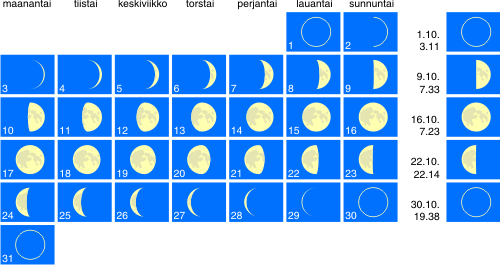 Kuun vaiheiden kaavioista puuttuu kuukauden viimeisen viikon päivät. Ohessa korjatut kaaviot: