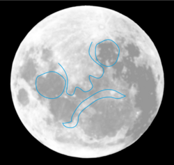 Kuu-ukon tapauksessa silminä toimivat Mare Imbrium (Sateiden meri) sekä Mare Serenitatis (Kirkkauden meri) + Mare Tranqullitatis (Rauhallisuuden meri), nenänä Mare Vaporum (Sumujen meri) + Sinus Aestuum (Kuumuuden lahti tai Vuoksilahti) ja suuna Oceanus Procellarumin (Myrskyjen valtameren) eteläosa yhdessä Mare Nubiumin (Pilvien meren) kanssa. Vaihtoehtoisessa versiossa silmät, nenä hieman eri tavoin hahmotettuna sekä hämmästyneenä suuna vain Mare Nubium.