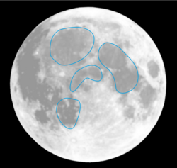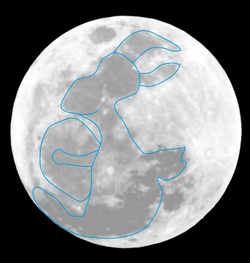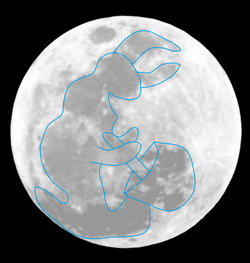 Kiinalaiset hahmottavat jäniksen käpäläksi Oceanus Procellarumin (Myrskyjen valtameri) Kuun itäisten merien toimiessa päänä ja korvina. Mare Imbrium (Sateiden meri) nähdään jäniksen kantamuksena.