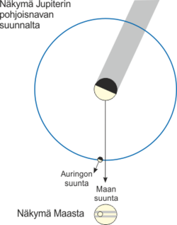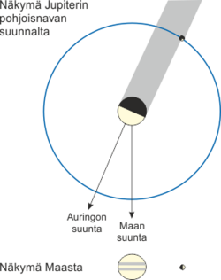 Kuun Jupiterinm pinnalle heittämä varjo etenee Jupiterin kiekon editse idästä länteen eli peruskaukoputkella nähtynä oikealta vasemmalle. Tapahtuma alkaa ja loppuu varjon keskipisteen saavuttaessa Jupiterin kiekon reunan.