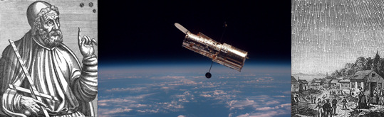Otsikkokuva: Klaudios Ptolemaios (tuntematon taiteilija, 1500-luku), Hubble-avaruusteleskooppi (Nasa) ja leonidien tähdenlentoparvi 1833 (Adolf Vollmy, 1888).