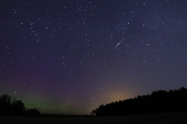 Kuva 1: Lyridien tähdenlentoparveen kuuluva meteori kuvattuna Ruskolla 23.4.2023. (Kuva © Mikko Peussa, käyttöoikeus vain tämän uutisen yhteydessä. Kuvaajan nimi mainittava.) jpg