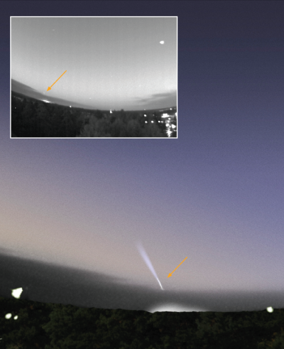 Yläkuva: Aki Taavitsaisen ja Jani Lauanteen tulipallokameran kuva Mikkelistä. Kameran kuvassa näkyvä osa salamasta on noin 20 - 25 kilometrin korkeudessa. Pääkuva: Valokuvaaja Ismo Luukkosen rekonstruktio Taavitsaisen ja Lauanteen pieniresoluutioisesta alkuperäiskuvasta. - jpg (© Satu Taavitsainen) Aki Taavitsainen ja Jani Lauanne.