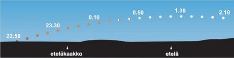Pimennyksen syvin vaihe koetaan kuitenkin vasta kello 23.13, jolloin Kuu on ehtinyt nousta Helsingissä noin kahden asteen (neljän täysikuun) korkeudelle. Pimennyksen loppuhetket näkyvät paremmin Kuun noustessa taivaalla korkeammalle.