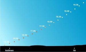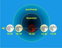 Koko Suomessa näkyy täydellinen kuunpimennys iltapäivällä ja illalla 10.12. Seuraavan kerran Kuu pimenee Suomessa täysin vasta vuonna 2015. Kuu pimenee täydellisesti, kun se kulkee radallaan Maan heittämän täysvarjon läpi, eikä auringonvalo pääse valaisemaan sen pintaa suoraan. Täydelliset kuunpimennykset ovat hiukan harvinaisempia kuin osittaiset pimennykset, mutta niistä päästään nauttimaan kuitenkin huomattavasti useammin kuin täydellisistä auringonpimennyksistä. Edellinen täydellinen kuunpimennys nähtiin maassamme 15.-16.6.2011. Seuraavan kerran Kuu pimenee täydellisesti Suomessa vasta 28.9.2015. Kuu on Etelä-Suomessa vielä horisontin alapuolella pimennyksen ensihetkien aikana, kun se ajautuu Maan puolivarjoon. Kuu ei kuitenkaan himmene paljoakaan vielä puolivarjon alueella, joten pimennyksestä ei menetetä paljoakaan. Täydellisen pimennysvaiheen alkaessa Kuu on jo ehtinyt nousta Helsingissä. Pohjois-Suomessa voidaan nähdä myös pimennyksen alkuhetket. Kuu nousee Rovaniemellä kello 13.09, Oulussa 14.09 ja Helsingissä 15.09. Utsjoella Kuu on koko päivän horisontin yläpuolella. Täydellinen pimennys alkaa kello 16.06 ja kestää 52 minuuttia. | Pimennyksen eteneminen Kuun kulkiessa Maan varjon läpi. Pimennys on täydellinen, kun Kuu on Maan täysvarjon alueella. Pimennyksen kulkuKuu nousee Rovaniemellä klo 13.09 |