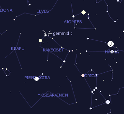 Geminidien parveen kuuluvia tähdenlentoja voi nähdä runsaasti koko viikon. Tähdenlentoparven huippu osuu tänä vuonna perjantaiaamuyöhöhön kello 1.30. Parven ns. säteilypiste eli radiantti sijaitsee lähellä Kaksosten Castor-tähteä. Parven meteorit näyttävät tulevan tältä alueelta. Kaksoset on korkealla taivaalla kaakon ja etelän välillä puolenyön aikaan. Lähistöllä, Härän tähdistössä loistaa Jupiter. Pilvet saattavat häiritä havaintoja.