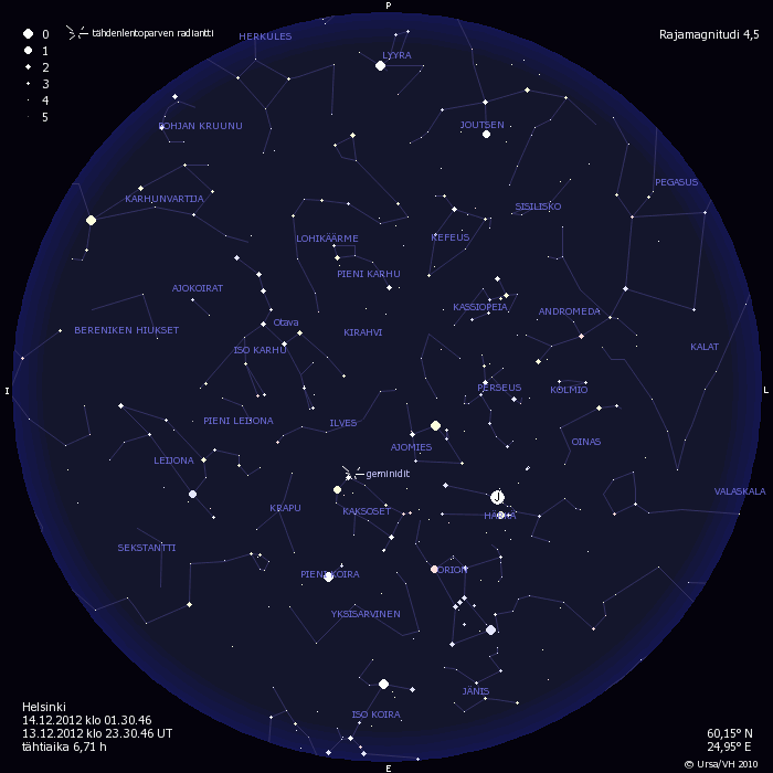 Geminidien tähdenlentoparvi aktiivisimmillaan 14.12.