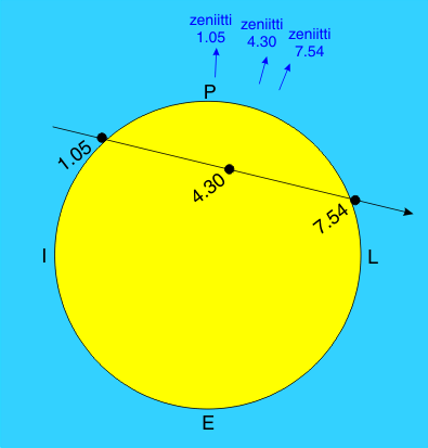 Kuvan selitys: Venuksen reitti Auringon editse alueilla, jossa ylikulku näkyy alusta asti. Tapahtumien kulku on muuten koko maassa samankaltainen. Kuvaan on merkitty myös taivaanlaen eli zeniitin suunta eri kellonaikoina. Venuksen koko kuvassa on oikeassa mittasuhteessa Auringon läpimittaan.