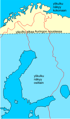 Ylikulun ensihetket voi havaita vain Sodankylän pohjoispuolella. Etelämpänä Aurinko nousee vasta ylikulun alettua.