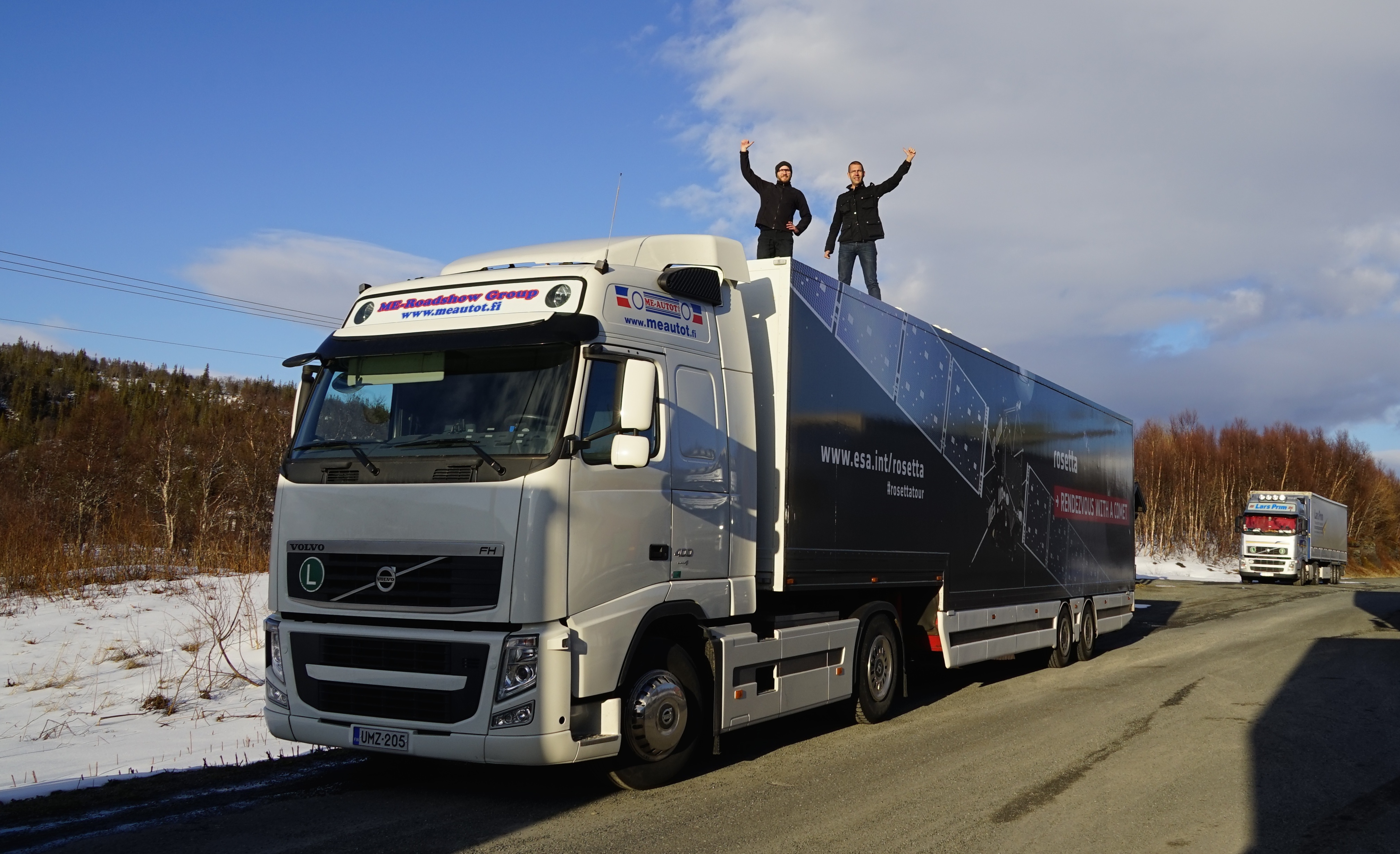 Kuvan selitys: Rekka ylittämässä Ruotsin ja Norjan rajaa, katolla avaruusrekkamiehet Tuukka Perhoniemi ja Jari Mäkinen.