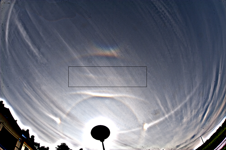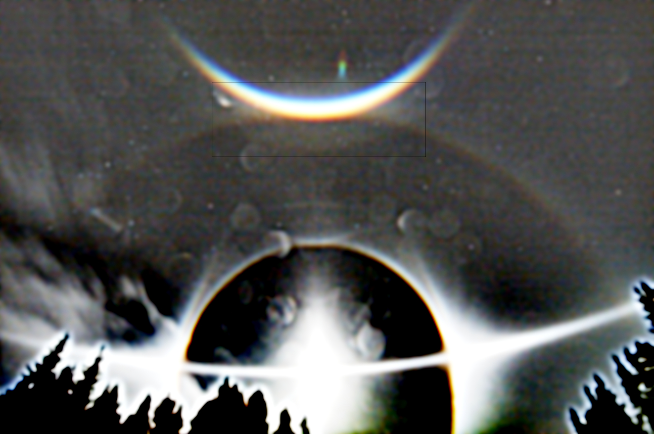 Kuvan selitys: Henrikssonin löytämä himmeä uusi halomuoto saatiin alkuperäisestä kuvasta esiin kuvankäsittelyn avulla. Uusi halo, pilarin zeniitinympäristön kaari, näkyy kuvan yläreunan kirkkaan, ylösaukeavan kaaren (zeniitinympäristön kaaren) alalaidassa keskellä himmeänä, laveana osana.