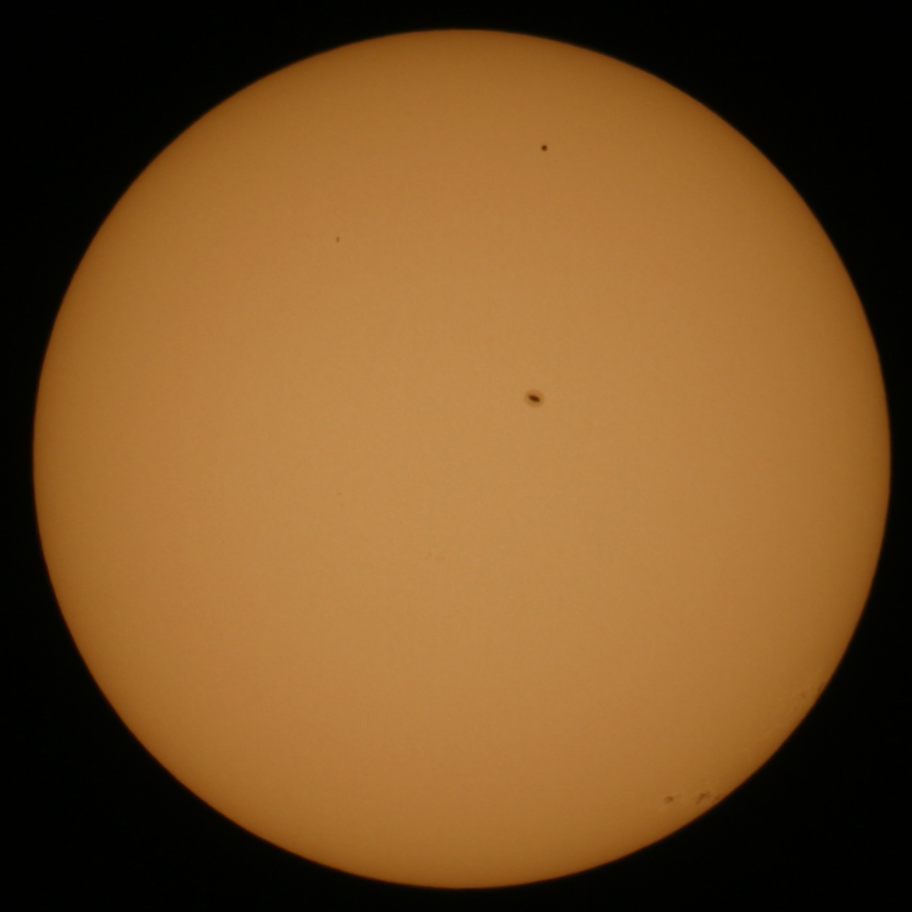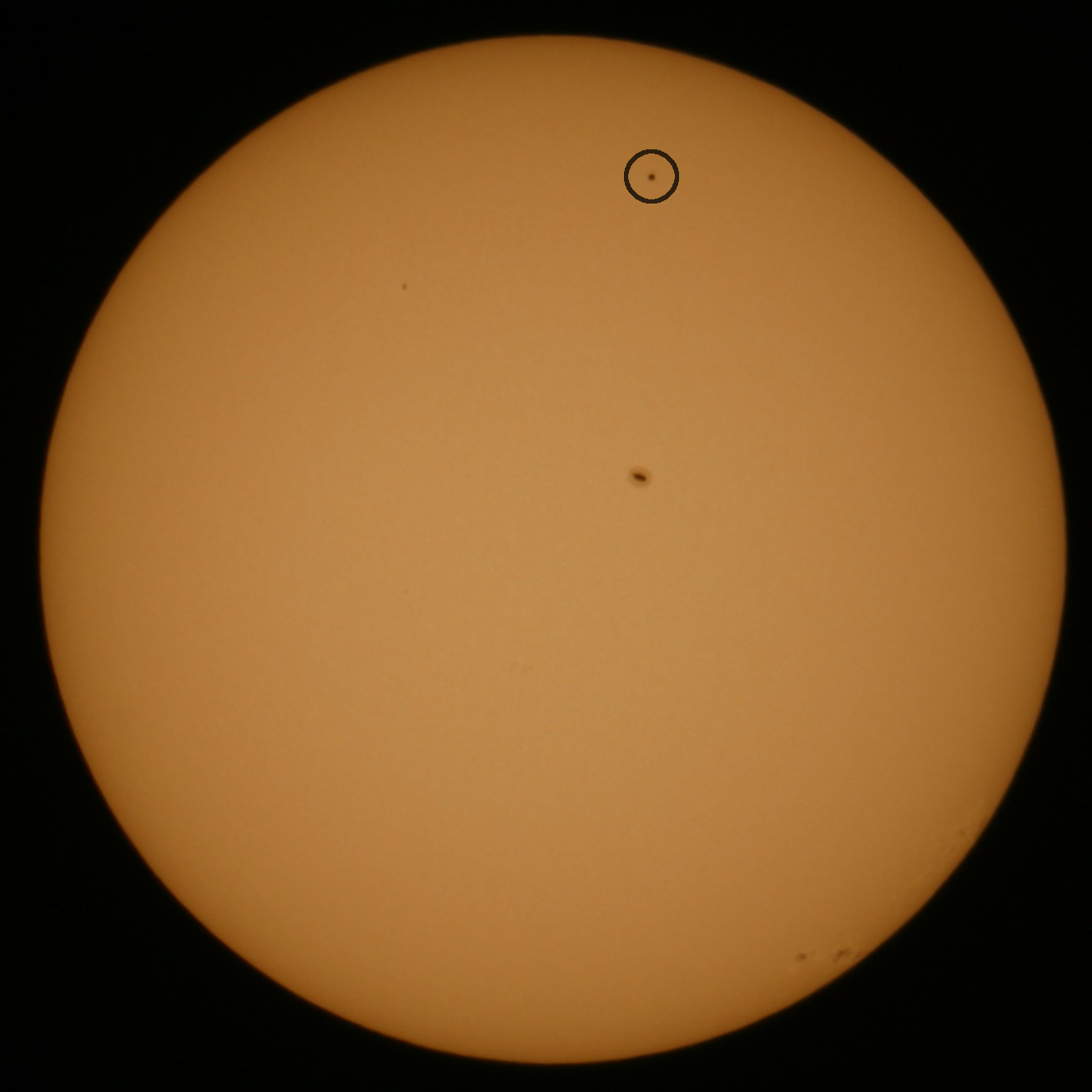 Kuvan selitys: Merkuriuksen ylikulku nähtiin Suomessa viimeksi 7.5.2003. Auringon pinnalla näkyy myös suurikokoinen auringonpilkku, jota ei tule sekoittaa Merkuriukseen. Merkuriuksen paikka on merkitty jälkimmäiseen kuvaan.