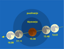 Kuva 2. Pimennyksen kulku. Sen aikana Kuu kulkee radallaan maapallon avaruuteen heittämien eri asteisten varjojen läpi. jpg Kuva Veikko Mäkelä / Ursa