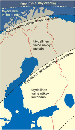 Kuva 3. Pimennyksen näkyminen Suomessa. Pimennys näkyy parhaiten maan eteläosissa, jossa pimennyksen täydellisen vaiheen voi nähdä kokonaan. pdf