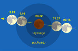 Kuva 1. Pimennyksen vaiheet taivaalla. Kuvaan merkityt täys- ja puolivarjon alue eivät todellisuudessa näy taivaalla. jpg
