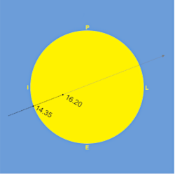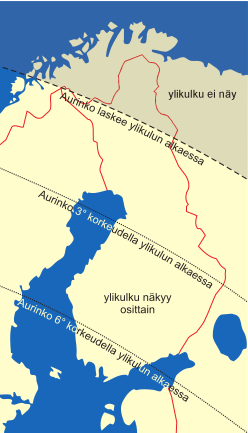Kuvan selitys: Ylikulun näkyminen Suomessa. Aurinko on matalalla koko maassa ylikulun aikana ja tapahtuma päättyy Suomessa kesken kaiken Auringon laskemiseen. Tapahtuma näkyy parhaiten Ahvenanmaalla, jossa Aurinko on ylikulun alkaessa 8° korkeudella. Inarissa ja Utsjoella ylikulkua ei voi havaita, sillä Aurinko on siellä koko ylikulun ajan horisontin alapuolella.