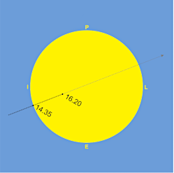 Kuvan selitys: Ylikulun reitti Auringon editse. Kuvaan on merkitty ylikulun alku- ja loppuhetki sekä hetki jona Merkurius on lähinnä Auringon keskiosaa. Zeniitin eli taivaanlaen suunta on merkitty kuvaan nuolilla. Koska Aurinko näyttää kääntyvän vuorokauden mittaan, zeniitin suunta muuttuu hiukan. Merkurius ja Aurinko ovat kuvassa todellisessa mittakaavassa toistensa suhteen.