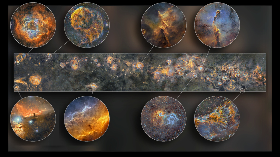Kuva 2. Linnunratamosaiikki keskellä. Ylhäällä ja alhaalla zoomauksia yksittäisiin tähtisumuihin. jpg