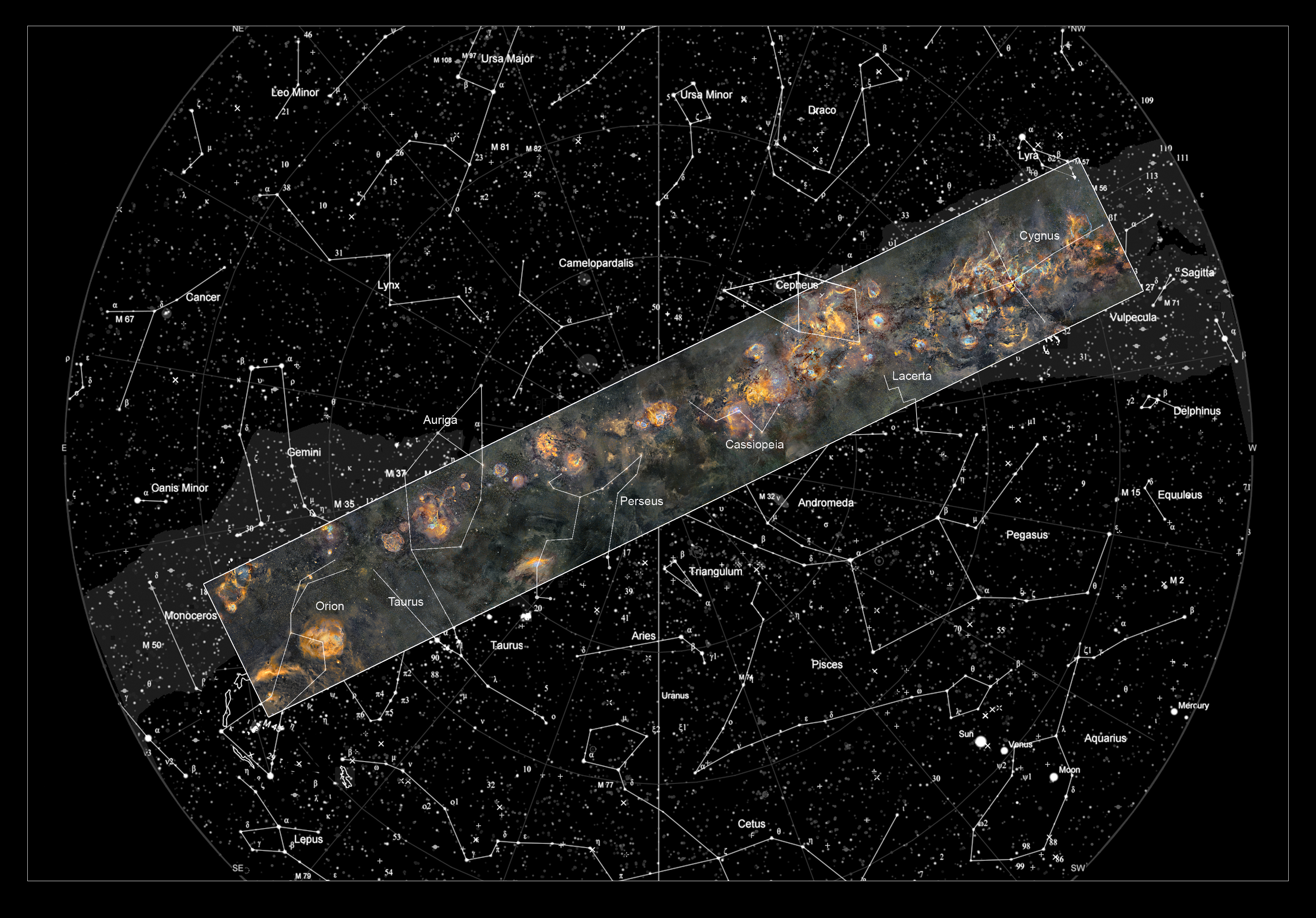 Metsävainio on nyt laajentanut kuvansa käsittämään peräti 145 astetta pohjoisesta yötaivaasta. Kuva-ala ulottuu Joutsenen tähdistöstä aina Orioniin ja Yksisarviseen asti.