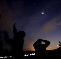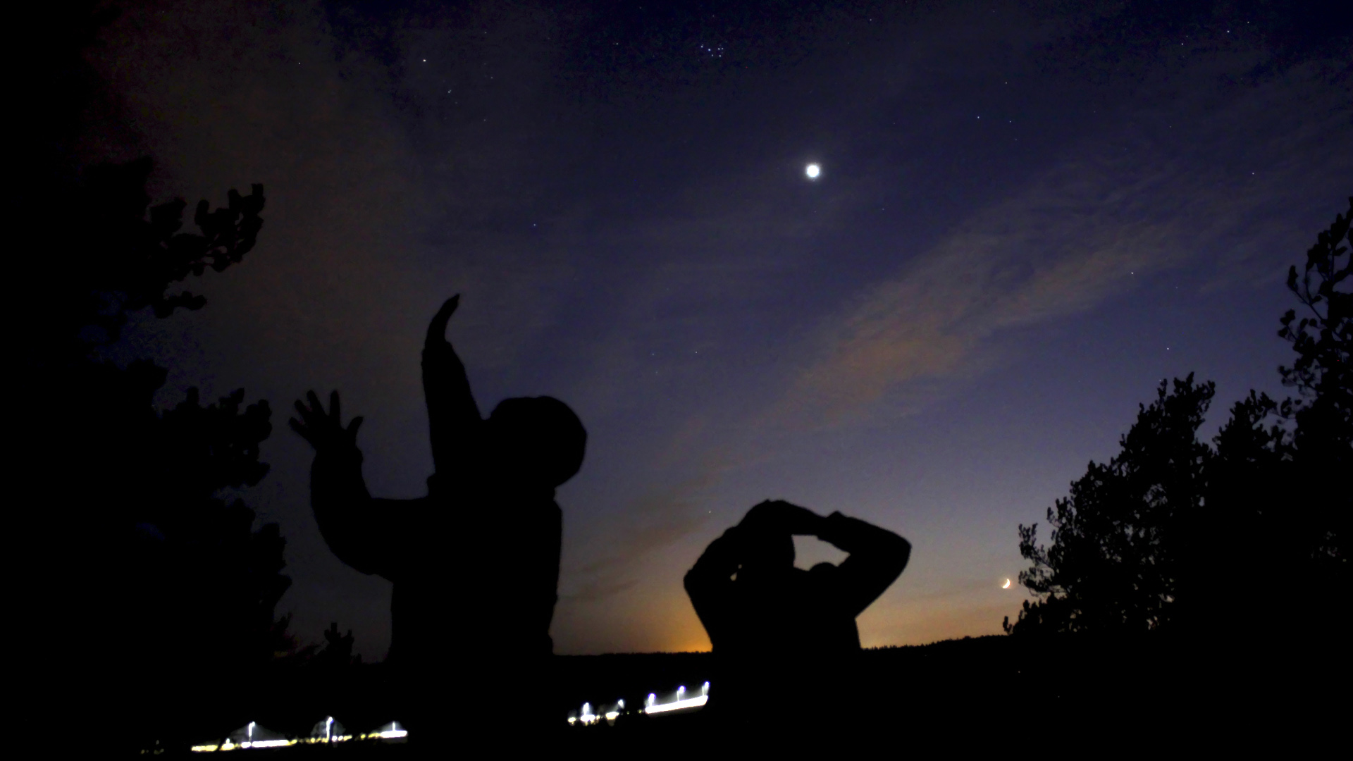 Kuva 2. Ihmisiä tähtitaivaan alla keväällä 2020. Taivaalla näkyivät Seulaset, Venus ja Kuu.