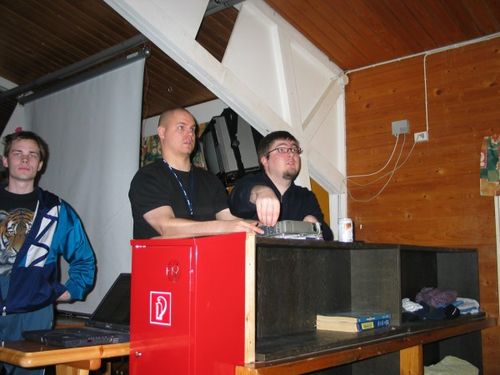 Perinteinen laitteistonvirittelykuva. Säätämässä Esa, Aki ja Henkka