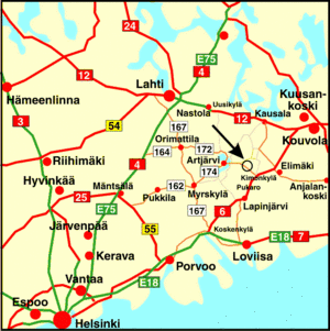 Lahden eteläpuolitse Orimattilaan 167-tietä, josta vasemmalle 172-tielle. Ajetaan Artjärvelle, josta jatketaan kuten Myrskylän tai Uusikylän kautta tullessa.