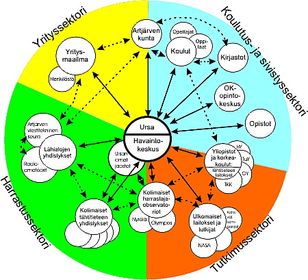 Yksi havaintokeskuksen keskeistä tavoitteita on lisätä eri kohderyhmien keskinäistä verkottumista (vuorovaikutusta). Kohderyhmien voidaan ajatella jakautuvan neljään pääsektoriin: harrastus-, tutkimus-, koulutus- ja sivistys- sekä yrityssektoriin. Oheinen kuva kertonee jotain siitä, kuinka laajoja keskuksen erilaiset kytkennät voisivat olla.