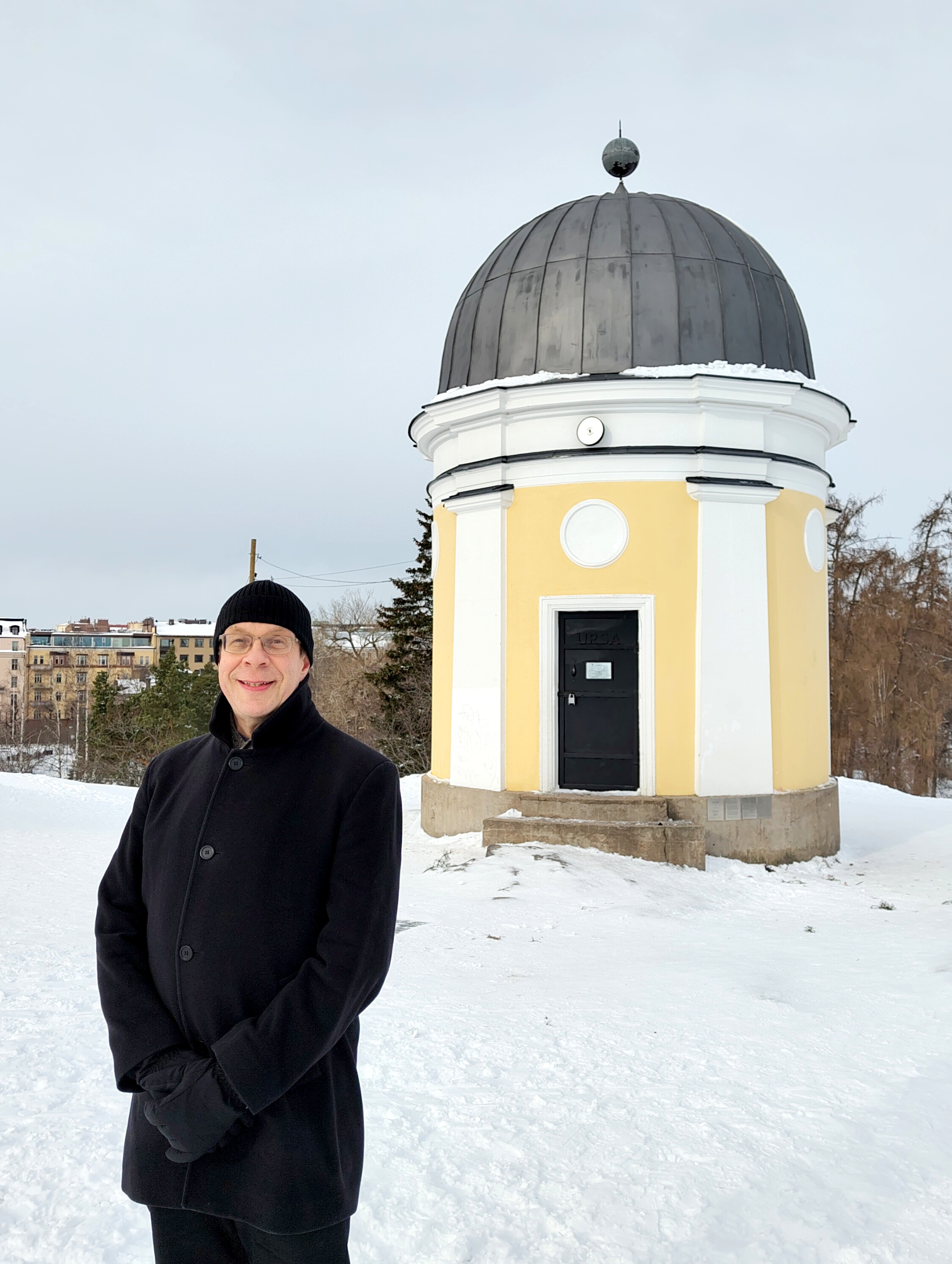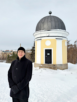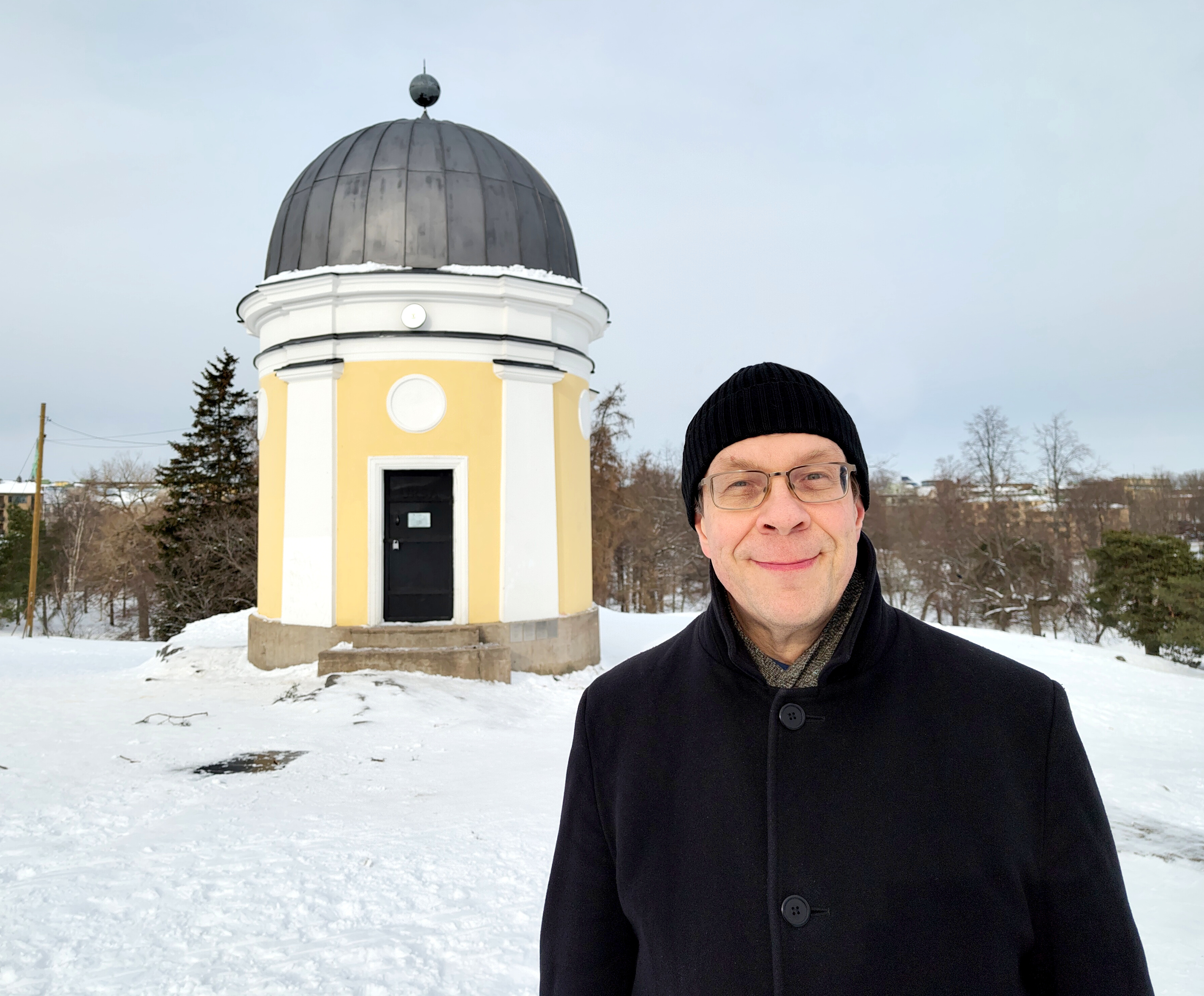 Kuva 2: Pekka Rautajoki kuvattuna Ursan tähtitornilla Helsingin Kaivopuistossa. Pystykuva. Kuva Ursa jpg