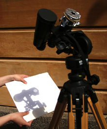 Kiikarilla Auringon kuvan voi projisoida turvallisesti. Turvallinen ja näyttävä tapa tarkkailla Aurinkoa on heijastaa sen kuva valkoiselle pahvinpalalle kiikarin avulla näiden ohjeiden mukaan.
