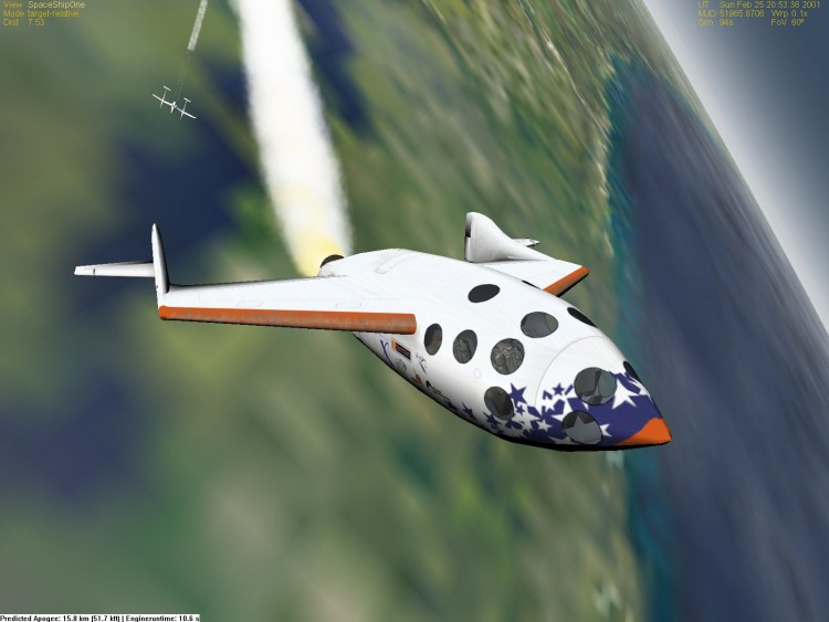 Tässä kuvassa on StarShipOne-lisäosan alus, jolla voi kokeilla, miten helppoa tai vaikeaa on kiihdyttää avaruuden rajalle eli sadan kilometrin korkeuteen, kun startti tapahtuu suihkulentokoneen kyydistä. Ei aivan niin helppoa kuin voisi luulla.