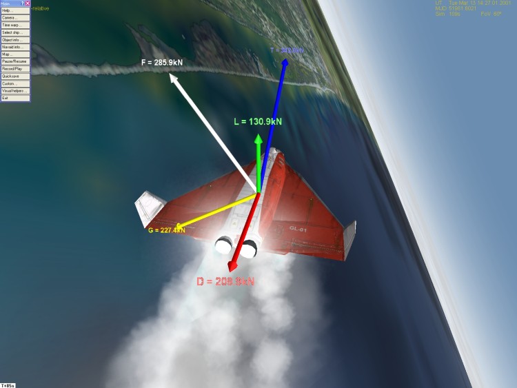 Halutessaan saa näkyviin esimerkiksi alukseen kohdistuvia voimia. Oheisessa kuvssa T on työntövoima, L on noste, G on gravitaatio, D on ilmanvastus ja F on voimien summa.