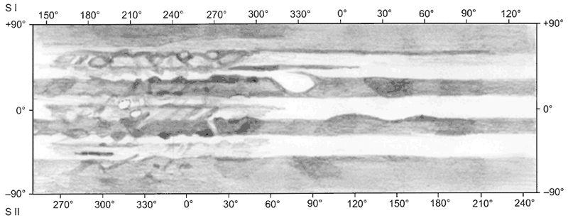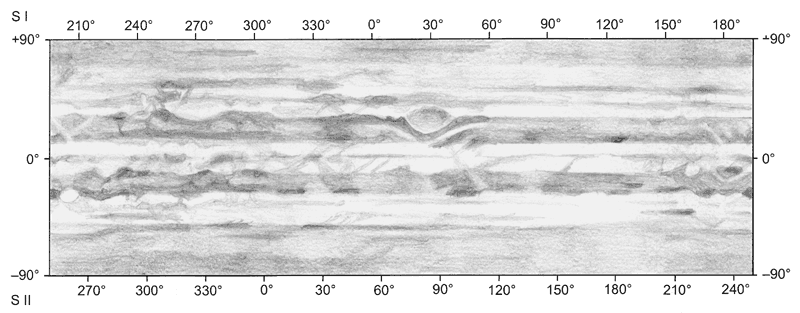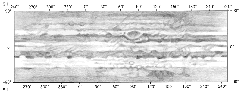 GRS:n muoto ja kirkkausjakauma näkyy selvästi, pilkku on yläreunastaan tummempi. GRS:n kolon alku sijaitsee kohdassa CM II = 72° ja itse pilkku on välillä noin CM II = 80-100°. SEB:n kaksijakoisuus ulottuu jonkinasteisena koko planeetan ympäri. Erityisen vahvat jaot on GRS:n molemmin puolin, CM II = 50-160°. Myös NEB:ssä on paikoin kaksiosaisuutta, mutta pääosin siinä näkyy vain tummia kohtia vyön pohjoisreunalla. STB:ssä on tumma kohta (ehkä yksi vyön ovaaleista) GRS:n edellä. Sama näkyy myös edellisviikon kartassa. NEB:ssä on selvä ovaali tai erillinen alue kohdassa CM I = 180°. Myös pohjoisreunan ovaali kohdassa CM II = 255° on selvä yksityiskohta. NTZ:ssä näkyy parikin tummaa kohtaa (NNTB:n viitteitä?). Myös napa-alueilla on selvästi yksityiskohtia.