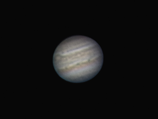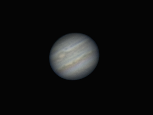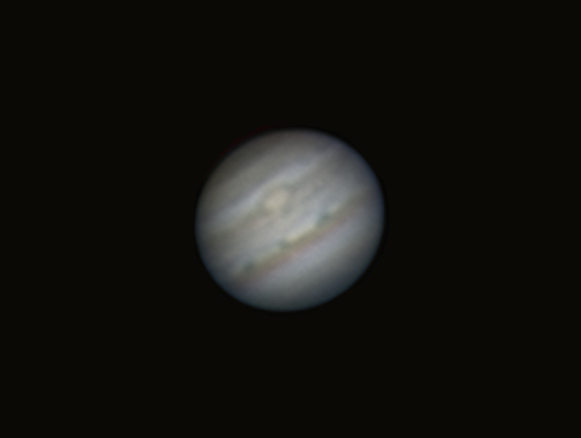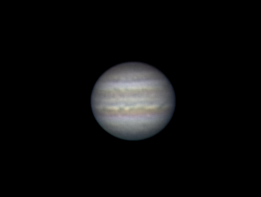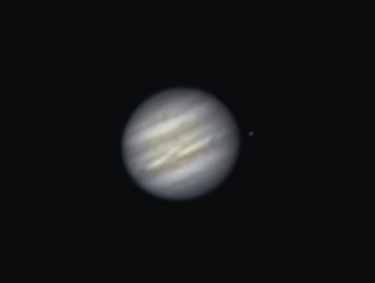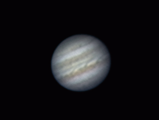 Tapio Lahtinen, Tampere Klo 23.38, CM I = 118, CM II = 184, CM III = 330 "Kokeilin vielä pienin odotuksin Jupiterin kuvaamista vaalealta taivaalta ja pienellä linssiputkella. Olin todella yllättynyt, kuinka hyvännäköiseltä Jupiter näytti sekä koneen ruudulta että visuaalisesti. Rakennuksen lämpösäteilyn väreily näkyi selvästä mutta silti yksi parhaista Jupiterhavainnoistani visuaalisesti. Käytetty visuaalisesti 100x-suurennusta (15mm + 2.5x PowerMate). Kuvaa kasvatettu 2-kertaiseksi K3CCDTools3:lla." |