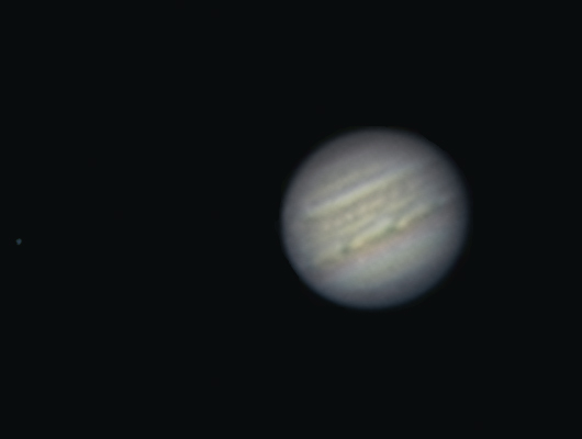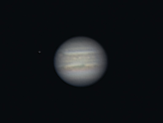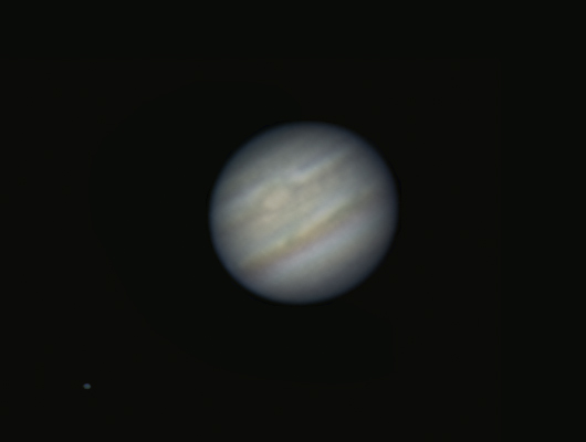 Lasse Ekblom, Nousiainen (60° 27' 32" N, 22° 03' 02" E) Klo 23.23, CM I = 196, CM II = 170, CM III = 321 "GRS on juuri poistumassa ja Kallisto on näkyvissä. Kauden viimeinen kuva. Korkeus 14,9°." Ks. myös http://www.noba-finland.org/Jupiter/ |