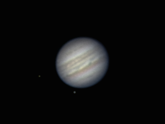 Tapio Lahtinen, Tampere Klo 0.55, CM I = 55, CM II = 334, CM III = 113 "Jupiter oli tässä vaiheessa noin 13 asteen korkeudella ja venyi ja vanui. Lopputulos oli sitten tällainen. Valitettavasti seuraavan kerran Jupiter on paremmin nähtävillä meillä Suomessa vasta ensi vuosikymmenellä. Mutta lämmintä oli tänä jo melko valoisana kevätyönä." |