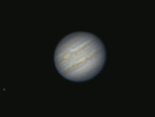 Lasse Ekblom, Nousiainen (60° 27' 32" N, 22° 03' 02" E) Klo 23.25, CM I = 102, CM II = 168, CM III = 316 "Jupiter ja Europa. Red Jr ajaa takaa GRS:ia. Korkeus 15,7°." Ks. myös http://www.noba-finland.org/Jupiter/ |