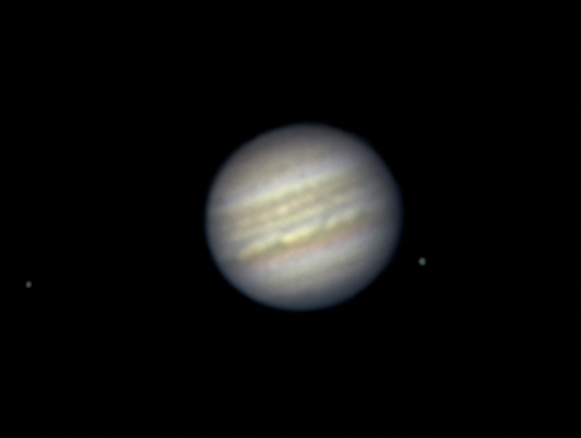 Lasse Ekblom, Nousiainen (60° 27' 32" N, 22° 03' 02" E) Klo 23.45, CM I = 14, CM II = 253, CM III = 33 "Ei yötä Suomessa tähän aikaan vuodesta, joten kuvaaminen muodostuulähes mahdottomaksi. Jupiterin 'toinen' puoli ja kaksi kuuta näkyvissä. Korkeus 14,3°." Ks. myös http://www.noba-finland.org/Jupiter/ |