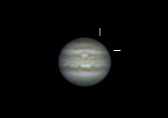 Lasse Ekblom, Nousiainen (60° 27' 32" N, 22° 03' 02" E) Klo 1.38, CM I = 71, CM II = 112, CM III = 248 "Ensi katselmus Red Jr. -pilkkuun. Jupiterin korkeus 13,9°." Ks. myös http://www.noba-finland.org/Jupiter/ |