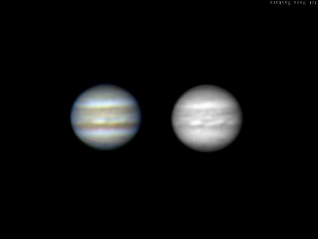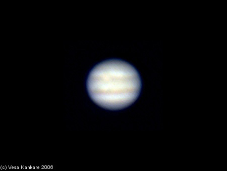Vesa Kankare, Kotka Klo 23.22, CM I = 200, CM II = 127, CM III = 267 "Jupiter oli ainoastaan reilun 12 asteen korkeudella kuvaushetkellä, mikä tietysti vaikeutti kuvaamista. Jokatapauksessa sain suuren punaisen pilkunkin kuvattua. Hieman parempi seeing jos olisi ollut, olisin saattanut pystyä erottamaan Red Jr.:ksi nimetyn punertuneen ovaalin BA." Ks. myös http://www.vkastronomy.com/entry_2006.05.08.15.10.html.fi |