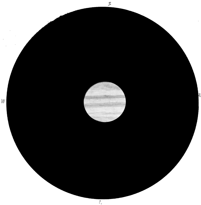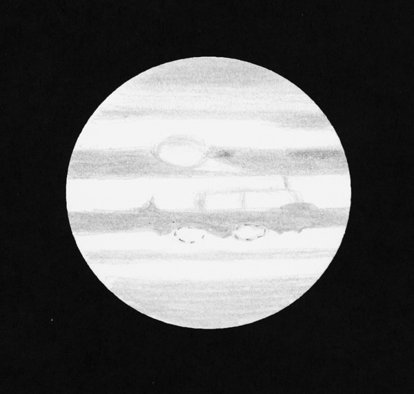 "Ohessa Jupiter-piirros. Seeing oli Jupiterin korkeuteen nähden yllättävän hyvä." |