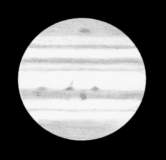 Jupiteriin osunut komeetan/asteroidin tumma jälki oli juuri kiertymässä näkyviin kuvassa luulen, kun iski väsy ja päätin lopettaa, kiintolevykin jo pullisteli Jupiterista. Vasta seuraavana päivänä huomasin että olisi kannattanut viellä jatkaa parikymmentä minuuttia.." |