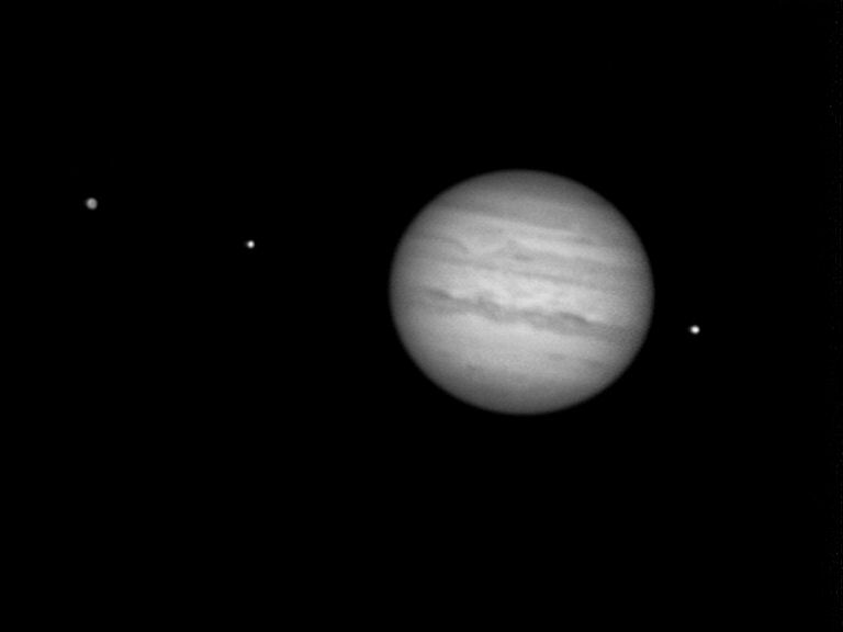 "Oli taasen pitkästä aikaa selkeää (osittain), mutta tietysti täysikuu joten oikein muuta järkevää ei kannattanut kuvata kuin Jupiteria. Sen verran pilviä kiisi taivaalla että Jupiter oli ehtinyt laskea jo 12 asteeseen. Ja keli oli aika surkea. Lähempänä Jupiteria Io ja siitä oikealle Europa. Aikaisemmin kulkivat hyvin lähellä toisiaan, mutta keskinäistä pimennystä ei tainnut kuitenkaan olla."