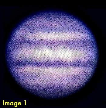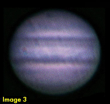 "Kuvasin Jupiteria Härkämäen kaukoputkella ja CCD-kameralla. Kohdistin kuvat AI4Win2-ohjelmalla, pinosin sitten ja käsittelin kuvaa MaxIm DL:n Wavelet Filter toiminnolla. Jupiterin pinnalla näkyy melko paljon yksityiskohtia, mm. Punainen pilkku ja vierellä himmeästi kolme kuuta. Törmäysjälki ei ollut nyt Maahan päin. Kohteesta olisi saanut varmaan enemmän irti, jos polttovälinlyhentäjä ei olisi ollut, vaan mieluummin Barlow. Sää oli selkeä ja lämmin. Jupiter oli aivan etelässä noin 13 asteen korkeudella. Kohde on todella komea isolla kiikarilla (15x80) katsottuna, kuut näkyvät hienosti ja myös kaasuvyöt." |