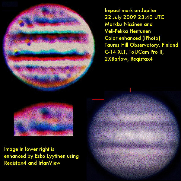 "Onnistuttiin kuvaamaan Jupiterin törmäysjälki keskiviikon ja torstain välisenä yönä klo 0–3. Jupiteria kuvattiin observatorion Celestron-kaukoputken ja web-kameran avulla. Jupiterin pinnalla oleva asteroidin tai komeetan aiheuttama törmäysjälki näkyi kuvissa erittäin selvästi. Kuvausten aikana näkyi selvästi myös Jupiterin nopea pyöriminen, kun törmäysjälki ja myös horisontin taakse kuvaamisen aikana siirtynyt Suuri punainen pilkku liikkuivat pyörimisen mukana.