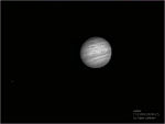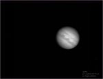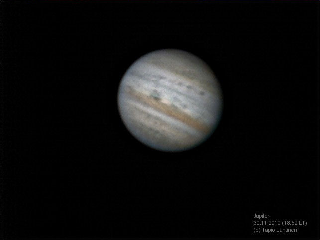 Tapio Lahtinen, Tampere Klo 18.10, CM I = 130, CM II = 292, CM III = 156 Klo 18.52, CM I = 155, CM II = 317, CM III = 182 "Toinen kuvauspäivä marraskuussa ja kun ennuste ei luvannut hääviä keliä, niin päätin testata edelleen Hyperion Zoomia planeettakuvaukseen. Johtopäätös on, että varsin kohtalaisen kokoisen suurennuksen saa ja kunhan keli on hyvä, niin yksityiskohtiakin on lupa odottaa. Varsin mielenkiintoiselta näyttää SEB-alue, jossa eteläinen vyö on pullahtamassa näkyville." Ks. myös http://www.ursa.fi/capella/ilmot/jupiter_301110.htm |