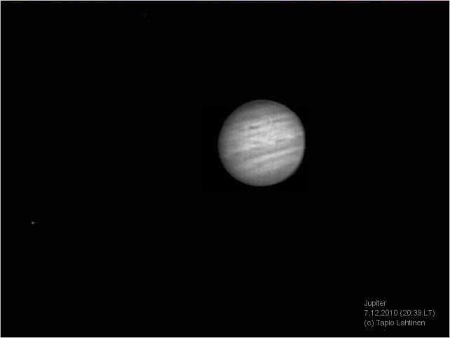 Tapio Lahtinen, Tampere Klo 20.39, CM I = 245, CM II = 353, CM III = 219 "En jaksanut viedä putkea ulos (kun sääennuste ei luvannut hyvää). Tässä siis tulos ikkunan läpi kuvattuna." Ks. myös http://www.ursa.fi/capella/ilmot/jupiter_071210.htm |