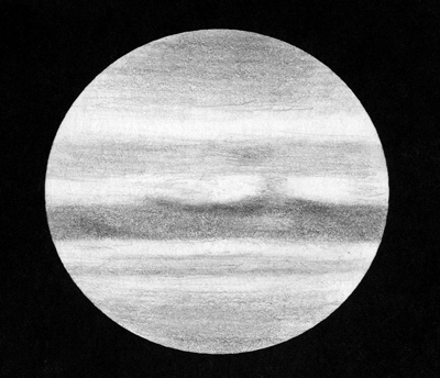 Jyri Lehtinen, Helsinki, Kaivopuisto Klo 22.47, CM I = 260, CM II = 136, CM III = 342 "Havaintohetkellä taivas oli paksun yläpilven peitossa, mutta seeing oli oikein hyvä ja Jupiteria pystyi havatsemaan suurella suurennuksella. Pinnan yksityiskohdat olivat silti keskittyneet pohjoisen ekvaattorivyön ympäristöön. Ko. vyössä näkyi useampi kaareva tummentuma pitkin sen reunoja sekä yksi vaalea läikkä vyln keskellä kahden selvimmän tummentuman välissä. Samojen tummentumien kohdalta lähti himmeä tumma silta yli ekvaattorin eteläiseen ekvaattorivyöhön, jonka keskellä oli lähellä sillan yhtymäkohtaa nähtävissä himmeä tummentuma. Itse eteläinen ekvaattorivyö oli sävyltään verrattavissa napakalotteihin. Pohjoisen ekvaattorivyön puhjoispuolella näkyi kaksi vierekkäistä kapeaa vyötä." |