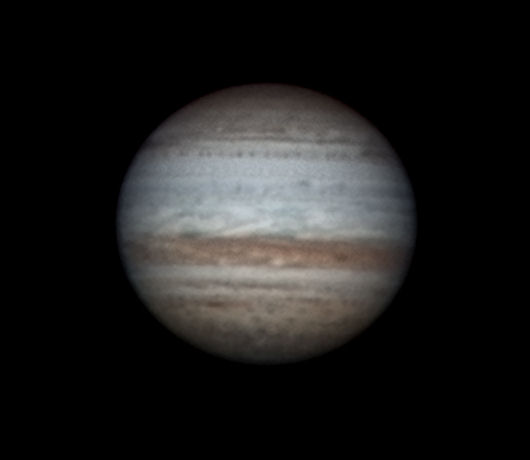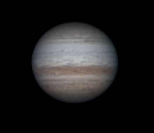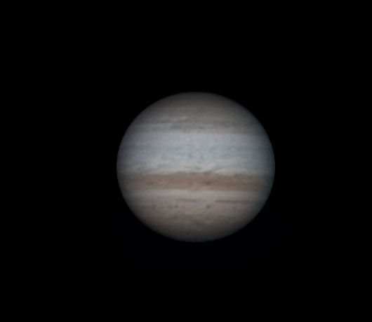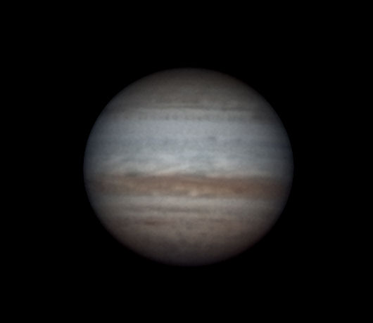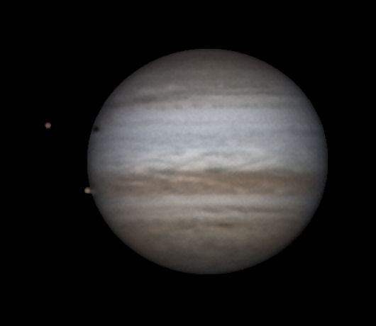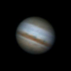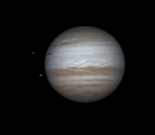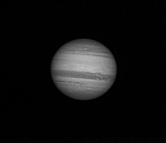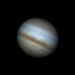 Toni Veikkolainen, Järvenpää, Kinnari Klo 1.13, CM I = 312, CM II = 49, CM III = 261 "Kolme Galilein kuuta hieman kaartuvassa linjassa. Jupiterilla edelleen vahva ja teräväreunainen pohjoinen ekvaattorivyö. Eteläisestä ei varmaa havaintoa. Napojen ympärillä tummentumat, joista eteläinen suurempi ja kontrastikkaampi." |
