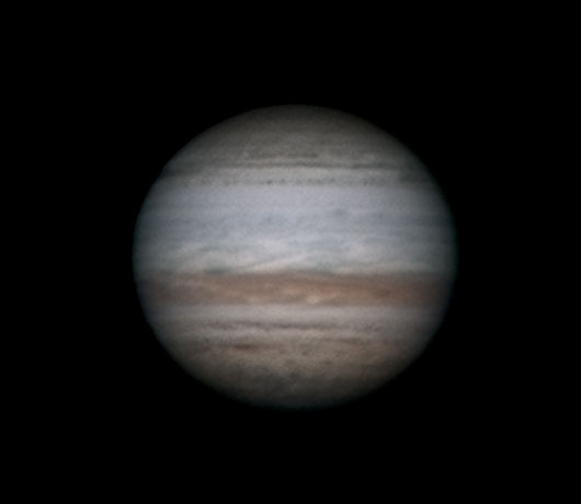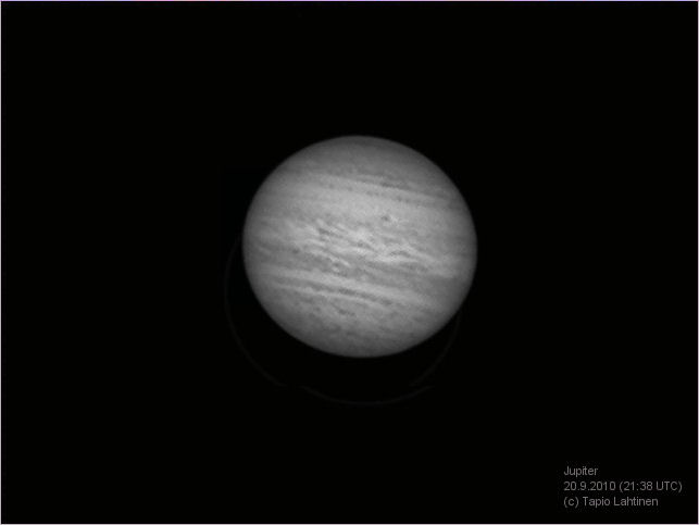 Juha Ojanperä, Parainen Klo 23.25, CM I = 110, CM II = 237, CM III = 75 "Aloitin tämän havaintokauden ja ensimmäinen kohde oli luontevasti Jupiter. Planeetan pohjoinen vyö näkyi hyvin kuten yleensäkin, mutta eteläinen vyö oli hyvin heikko. Vyöhän teki toukokuussa katoamistempun, mutta lienee sittemmin vahvistunut taas hieman." Ks. myös http://taivaanpallo.blogspot.com/2010/09/ |