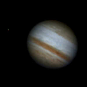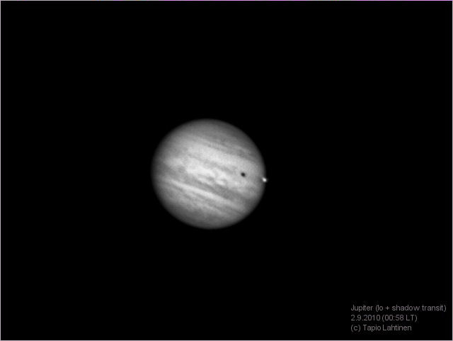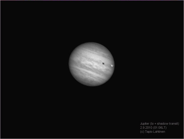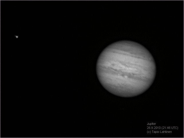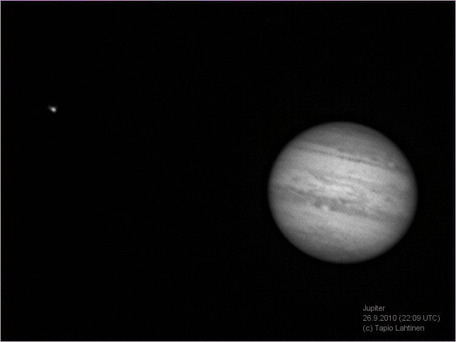 Tapio Lahtinen, Tampere Klo 0.28, CM I = 148, CM II = 275, CM III = 113 "Jalustan säätöä ja lopuksi Jupiterin kuvausta. Sattuipa taas Ion ylikulku osumaan kuvaan." Ks. myös http://www.ursa.fi/capella/ilmot/jupiter_020910.htm |